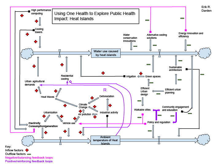 My first attempt at a stock and flow diagram illustrating the systemic relationship between heat islands and water use.
